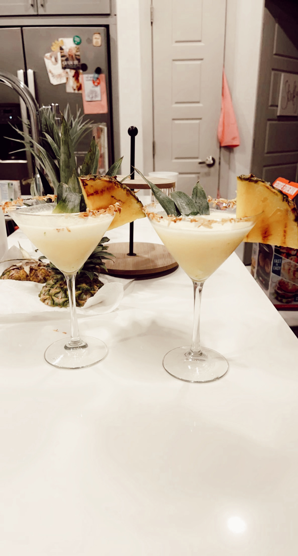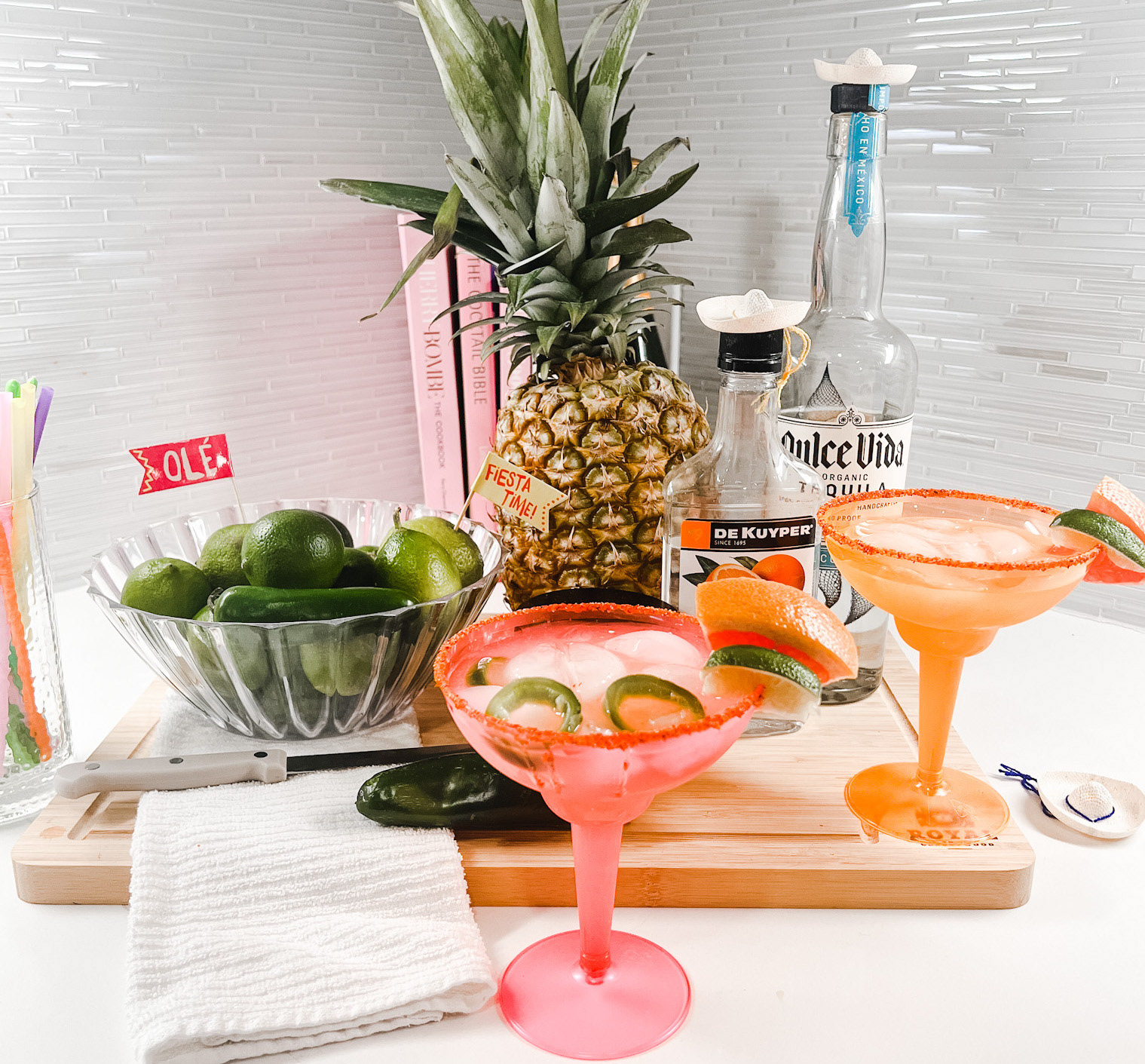 I bought an extra pineapple to keep in the back which added height and texture. Then I laid out the tequila, agave, and triple sec. I used one of our plain white kitchen towels to add texture. I put plain plastic straws I already had in my pantry in a cute container from the dollar tree and mixed in a few cactus drink spoons from the summer seasonal section of the dollar tree. Lastly, I put everything on a plain wooden cutting board I use for our charcuterie boards to help separate this section and create a station-like feeling.
