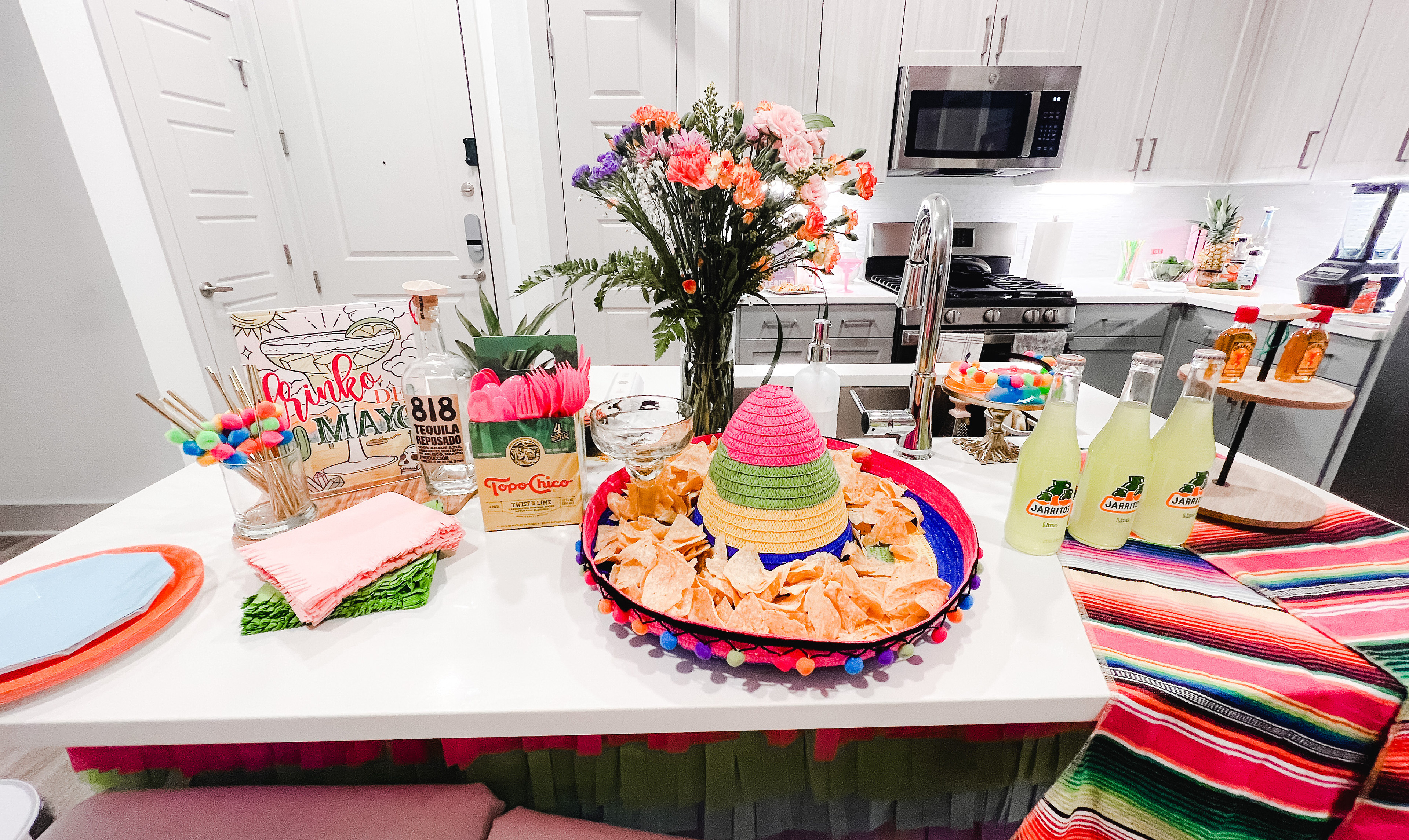 Creating a drink station to display your ingredients is a great way to decorate an entire section of your space with items you already have. For this party we did a coconut grilled pineapple margarita. I toasted coconut and put it in a cute glass container (an old candle I took the wax out of). We put limes and jalapeños in a clear glass bowl I got from the dollar tree and to make it festive I added cute fiesta cupcake toppers I bought at Hobby Lobby (you can also diy festive picks using toothpicks, a hot glue gun, and any sort of festive item or paper you have laying around).